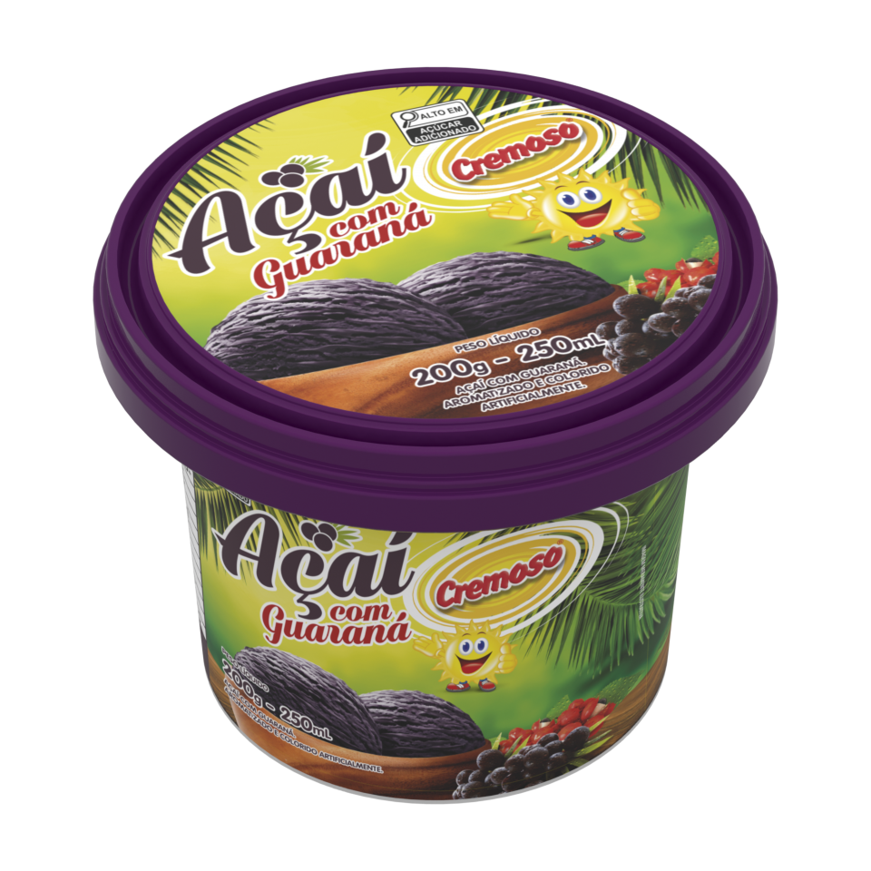 INGREDIENTES: Água, Açúcar, Polpa de Açaí Natural, Xarope de Glucose (Açúcar, Água, Acidulante), Estabilizante ((Gordura Vegetal, Amido Modificado, Maltodextrina, Monoglicerídeos de Ácidos Graxos Destilados (INS 471), Emulsificantes: Ésteres De Monoglicerídeos Com Ácido Lático (INS 472b)) e (Açúcar e Espessantes: Goma Guar (INS 412), Goma Xantana (INS 415) e Carboximetilcelulose (CMC) (INS 466)), Aroma Artificial de Guaraná (Álcool, Água e Substâncias Aromatizantes), Sabor Artificial Açaí com Guaraná (Água, Álcool, Aromatizante Sintético Idêntico ao Natural, Corantes Artificiais: Vermelho 40 (INS 129) e Azul Brilhante FCF (INS 133)), Ácido Cítrico. NÃO CONTÉM GLÚTEN. NÃO CONTÉM LACTOSE. ALÉRGICOS: PODE CONTER DERIVADOS DE LEITE, SOJA E DERIVADOS.