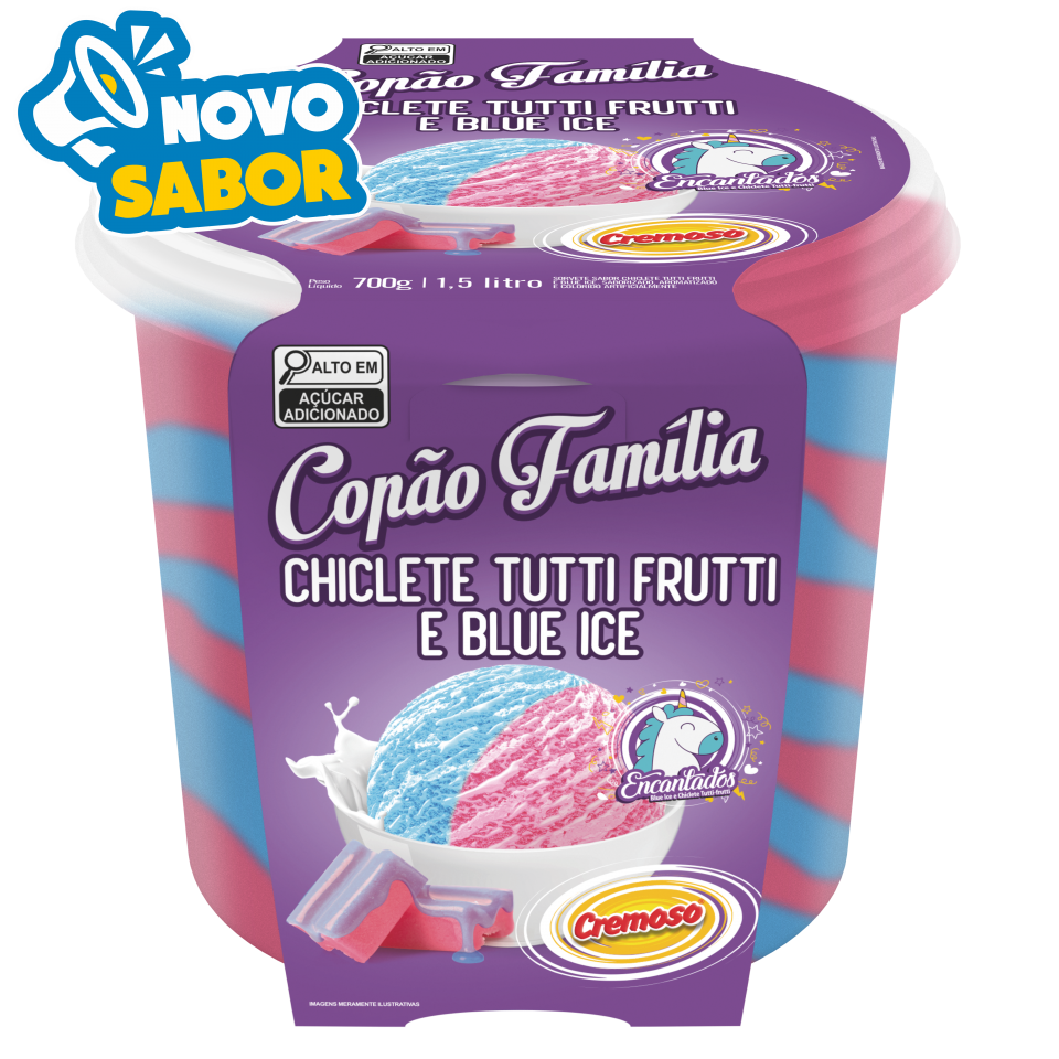 INGREDIENTES: Água, açúcar, composto lácteo (soro de leite líquido, xarope de glicose, gordura vegetal, concentrado proteico de soro de leite em pó, leite em pó desnatado, leite em pó integral, leitelho em pó, aromatizantes, regulador de acidez bicarbonato de sódio e emulsificante mono e diglicerídeos de ácidos graxos), xarope de glicose, sabor artificial chiclete tutti frutti, sabor artificial blue ice, gordura vegetal, emulsificantes ésteres de ácidos graxos com propilenoglicol e mono e diglicerídeos de ácidos graxos, goma guar, carboximetilcelulose sódica, estabilizante difosfato tetrassódico e antioxidante mistura concentrada de tocoferóis, aromatizantes sintéticos, corantes artificiais: ponceau 4R e azul brilhante FCF. CONTÉM GLÚTEN. CONTÉM LACTOSE. ALÉRGICOS: CONTÉM DERIVADOS DE LEITE E SOJA.